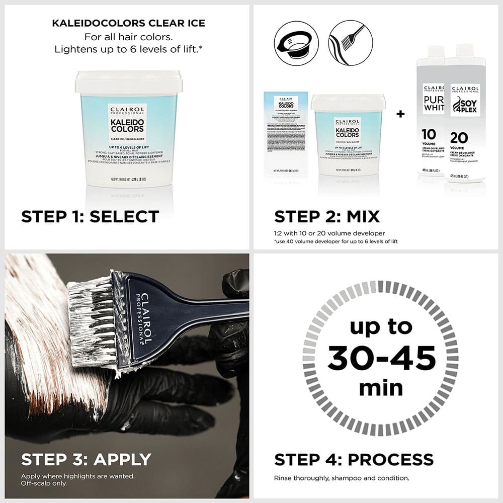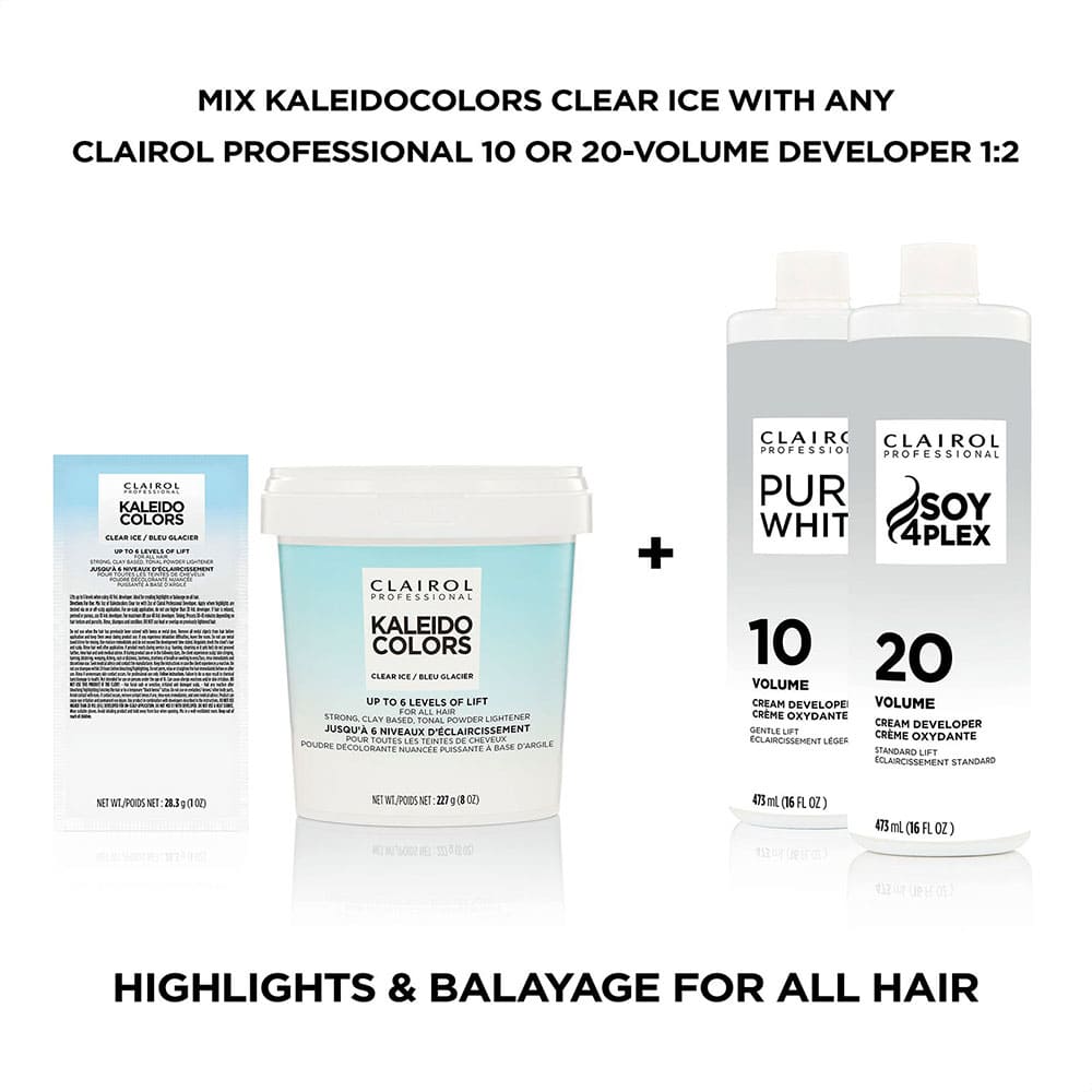 Clairol Professional(R) Kaleidocolors Clear Ice is a clay-based tonal powder lightener for use on all hair colors. Ideal for balayage and highlights. Lightens hair up to 6 levels.
